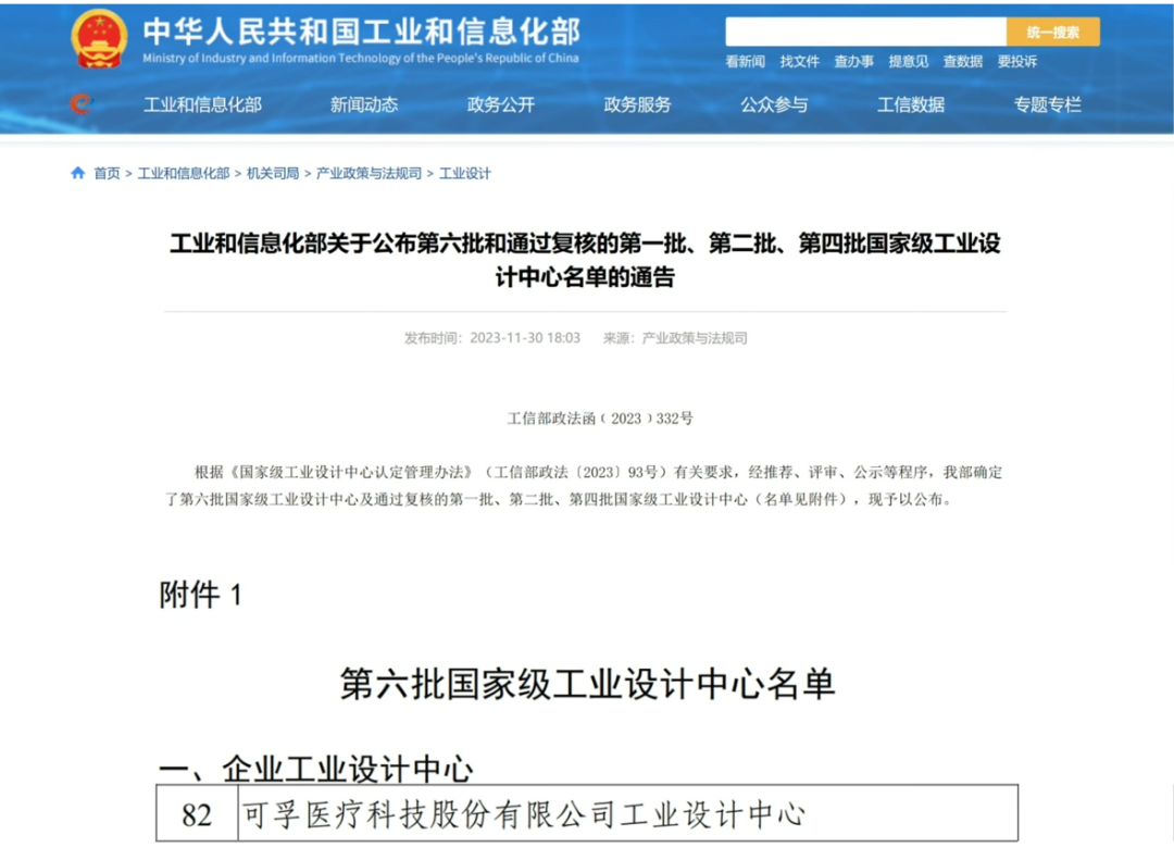 可孚医疗凭借出色的创新能力、突出的业绩、领先的发展水平,获得国家和行业的一致认可,正式入选成为国家级工业设计中心。