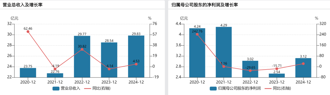 从营收规模上来看,近五年可孚医疗整体保持增长态势,营收已由2020年的约24亿元增长至2024年约30亿元,但归母净利润却不及前几年,由2020年的4.24亿元降至2024年的3.12亿元,盈利效率有所承压。