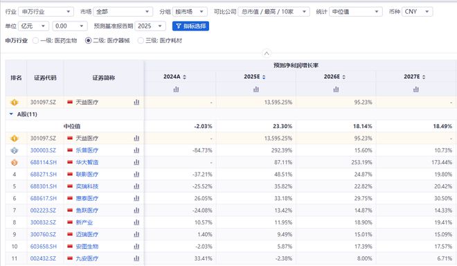 截至6月15日,33只个股预测2025净利润增长率超过1000%。其中,天益医疗以13595.25%的净利润增长率高居榜首。