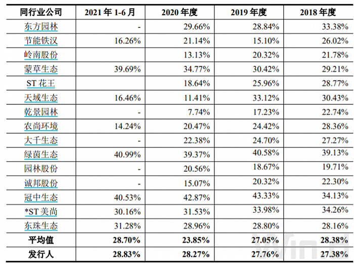 由于金埔园林所处的园林行业较为特殊,经营模式以与政府合作的PPP项目居多。2018年起,行业内上市公司经营情况受到影响,收入出现了下滑的情况。招股书显示,2018年—2021年年中,行业内上市公司平均营业收入呈逐年下降趋势,分别为29.72亿元、23.44亿元、21.51亿元以及8.53亿元;增速分别为9.97%、-3.87%、-9.27%以及-1.37%。