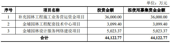 此前披露的招股书显示,金埔园林原拟募资4.41亿元,拟分别用于“补充园林工程施工业务营运资金项目”、“金埔园林工程配套技术中心项目”、“金埔园林设计服务网络建设项目”。