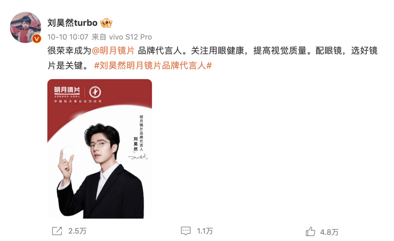 10月10日上午,刘昊然在个人微博官宣新代言,并表示“很荣幸成为明月镜片的代言人”,激起微博粉丝热烈讨论,#刘昊然明月镜片品牌代言人#相关内容登上热搜,当天阅读量就破了8600万。