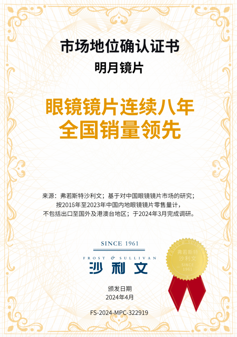 沙利文是全球权威的行业研究及咨询机构,以专业的第三方调查及评估而闻名,其颁发的官方认证具有极高的权威性。此次认证意味着明月镜片市场销量和地位方面获得国际权威认可,进一步夯实其作为镜片品牌的全国领先地位。