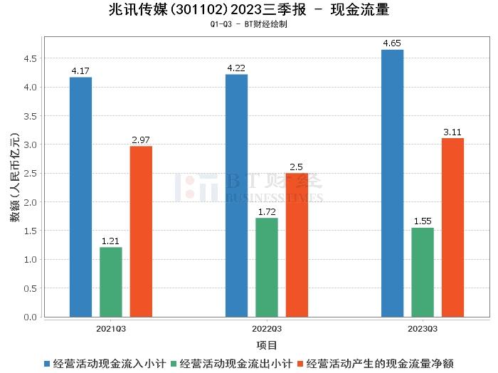 在现金流量方面,兆讯传媒2023年三季度的经营活动产生的现金流量净额为3.11亿元,高于上年同期的2.5亿元。经营活动现金流入小计为4.65亿元,略高于上年同期的4.22亿元。经营活动现金流出小计为1.55亿元,低于上年同期的1.72亿元。