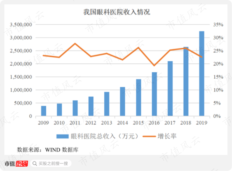 据统计数据,我国眼科医院2019年的收入规模已达到325亿元,过去10年收入的年均复合增长率(CAGR)达23.7%。