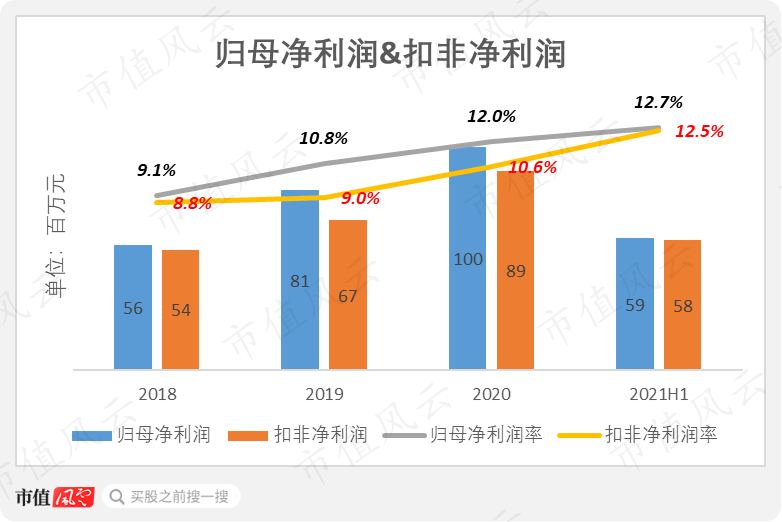 2021年上半年,公司实现归母净利润和扣非净利润分别为5900万元和5800万元,对应的归母净利润率和扣非净利润率分别为12.7%和12.5%。