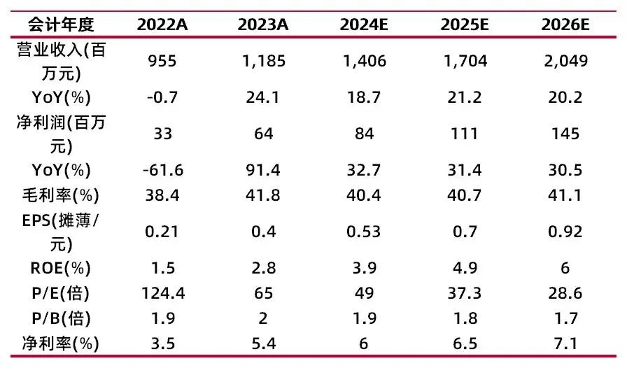 预计公司2024-2026年营业收入分别为14.06、17.04、20.49亿元,增速分别为18.7%、21.2%、20.2%,净利润分别为0.84、1.11、1.45亿元,增速分别为32.7%、31.4%、30.5%,对应EPS分别为0.53、0.70、0.92元,以5月7日收盘价26.15元计算,对应PE分别为49.0X、37.3X、28.6X。考虑到公司的眼健康医疗服务已逐步恢复至正常水平,维持“增持-B”评级。