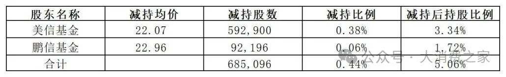 根据之前预披露的减持信息,美信基金及其一致行动人鹏信基金计划在三个月内通过集中竞价交易减持不超过830,000股,占剔除公司回购专用账户股份数量后总股本的0.53%。最终,美信基金以22.07元/股的均价减持了59.3万股,减持比例0.38%;鹏信基金以22.96元/股的均价减持了9.2万股,减持比例0.06%。减持计划实施完成后,两股东合计持股比例仍超过5%。
