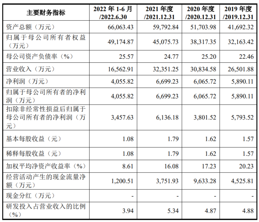 2019年至2022年1-6月,鸿铭股份营业收入分别为26,501.88万元、30,834.58万元、32,351.25万元和16,562.91万元;净利润/归属于母公司所有者的净利润分别为5,890.11万元、6,065.72万元、6,699.23万元和4,055.82万元;扣除非经常性损益后归属于母公司所有者的净利润分别为5,793.52万元、3,801.52万元、6,136.18万元和3,457.63万元。