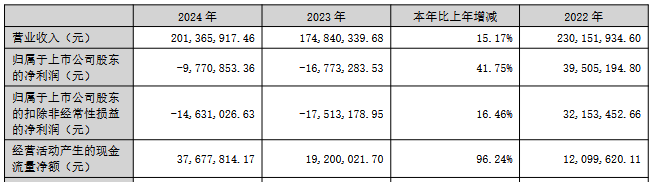2023年至2024年,鸿铭股份营业收入分别为1.75亿元、2.01亿元,归属于上市公司股东的净利润分别为-1,677.33万元、-977.09万元,归属于上市公司股东的扣除非经常性损益的净利润分别为-1,751.32万元、-1,463.10万元,经营活动产生的现金流量净额为1,920.00万元、3,767.78万元。