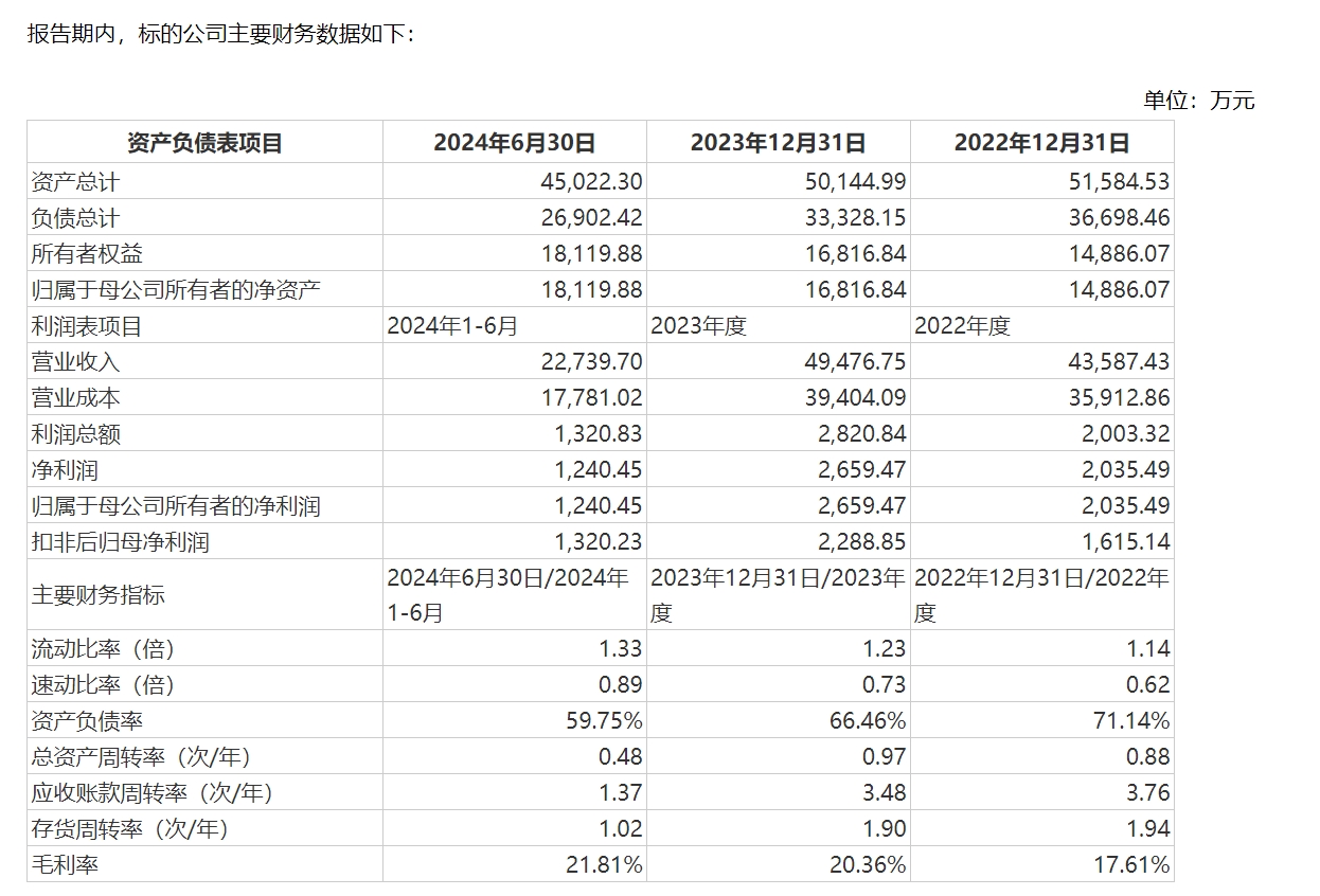 财务数据方面。2022年、2023年以及2024年上半年,新通达分别实现营收4.36亿元、4.95亿元、2.27亿元,净利润分别录得0.20亿元、0.27亿元、0.12亿元。公司偿债能力较弱,连续两年多速动比率低于1。