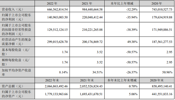 2020年至2022年,洁雅股份的营收分别为7.43亿元、9.84亿元和6.67亿元;增速分别为167.82%、32.5%和-32.29%。净利润分别为1.8亿元、2.2亿元和1.41亿元;增速分别为163.69%、22.5%和-35.94%。