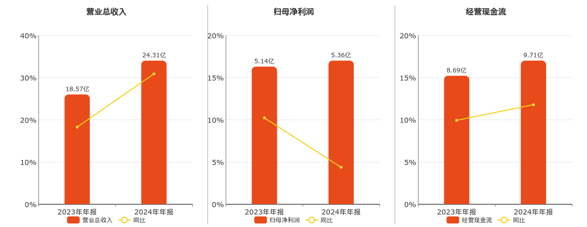 公司营业总收入为24.31亿元。归母净利润为5.36亿元。经营活动现金净流入为9.71亿元。