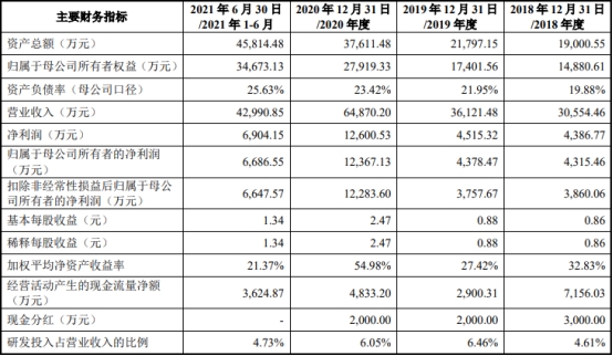 2018年至2021年1-6月,青木股份营业收入分别为3.06亿元、3.61亿元、6.49亿元、4.30亿元;净利润分别为4386.77万元、4515.32万元、1.26亿元、6904.15万元;归属于母公司所有者的净利润4315.46万元、4378.47万元、1.24亿元、6686.55万元;扣除非经常性损益后归属于母公司所有者的净利润分别为3860.06万元、3757.67万元、1.23亿元、6647.57万元;经营活动产生的现金流量净额分别为7156.03万元、2900.31万元、4833.20万元、3624.87万元。