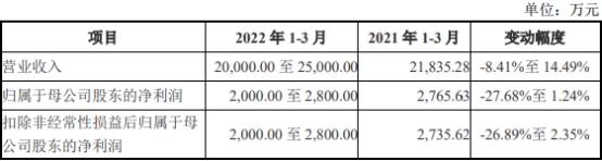 青木股份预计2022年1-3月实现营业收入2.00亿元至2.50亿元,变动幅度为-8.41%至14.49%;实现归属于母公司股东的净利润为2000.00万元至 2800.00万元,变动幅度为-27.68%至 1.24%;扣除非经常性损益后归属于母公司股东的净利润为2000.00万元至 2800.00万元,变动幅度为-26.89%至2.35%。