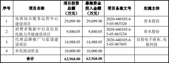 青木股份本次募集资金总额为10.52亿元,募集资金净额为9.51亿元。青木股份最终募集资金净额比原计划多3.11亿元。青木股份2022年3月8日披露的招股书显示,公司拟募集资金6.40亿元,分别用于电商综合服务运营中心建设项目、消费者数据中台及信息化能力升级建设项目、代理品牌推广与渠道建设项目、补充流动资金。
