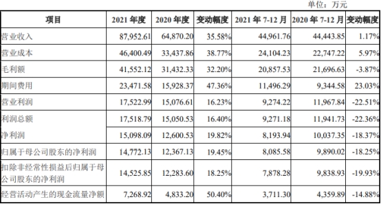 2021年,青木股份营业收入为8.80亿元,同比增长35.58%;净利润为1.51亿元,同比增长19.82%;归属于母公司股东的净利润为1.48亿元,同比增长19.45%;扣除非经常性损益后归属于母公司股东的净利润为1.45亿元,同比增长18.25%;经营活动产生的现金流量净额为7268.92万元,同比增加50.40%。