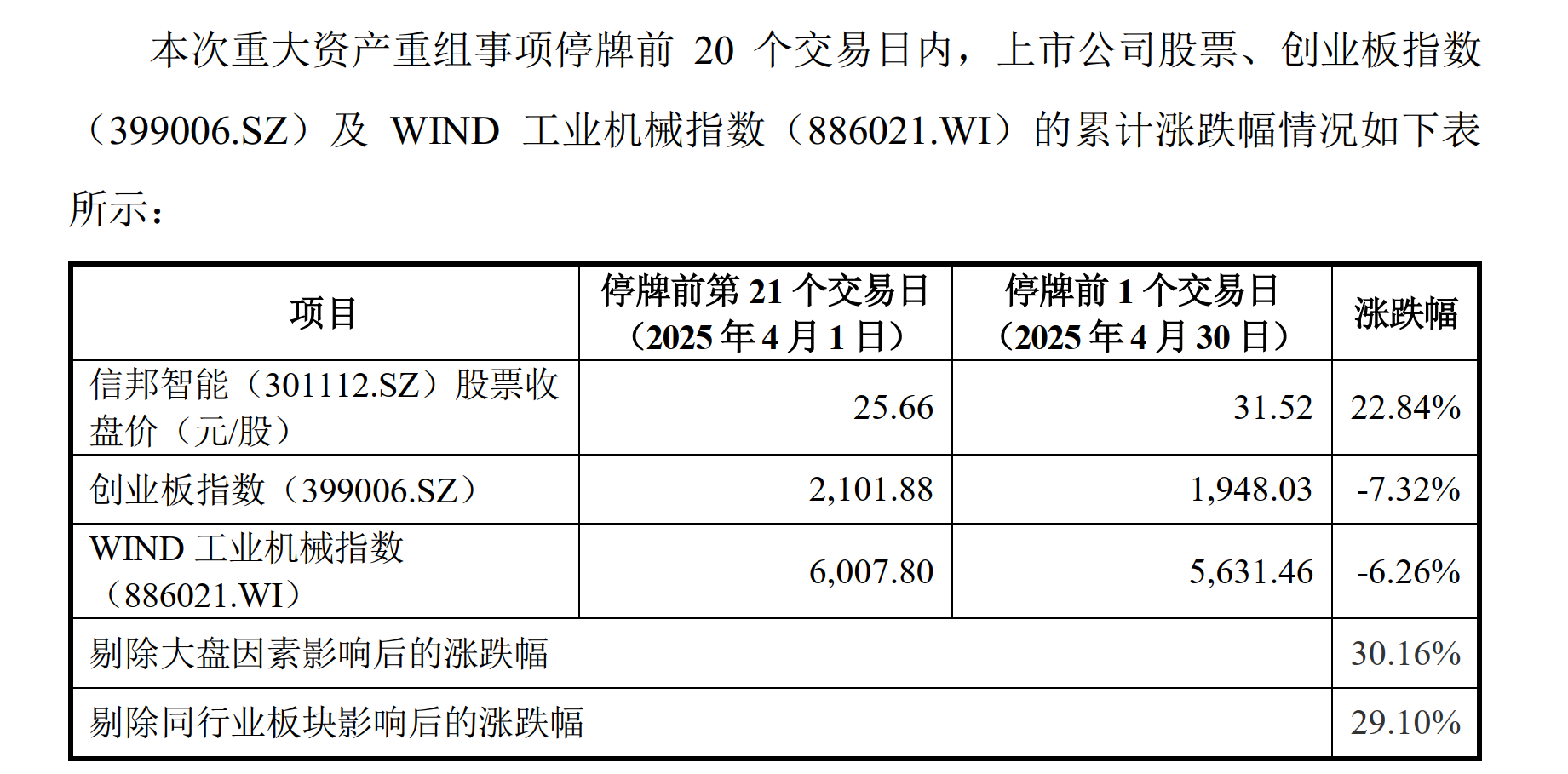 信邦智能在公告中表示,其重大资产重组停牌前第21个交易日(即4月1日)收盘价格为25.66元/股,停牌前一交易日(即4月30日)收盘价格为31.52元/股,股票收盘价累计上涨22.84%。