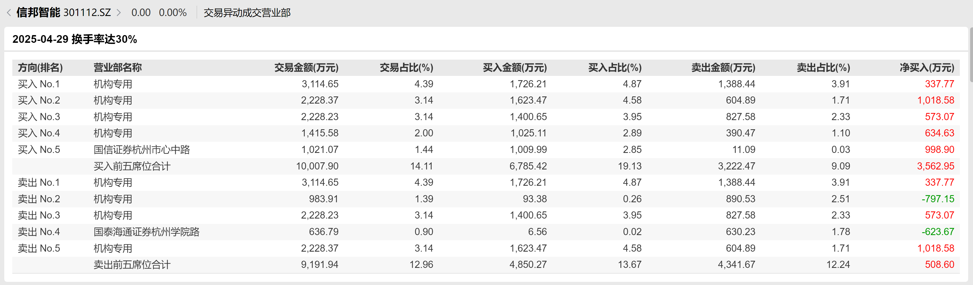 《每日经济新闻》记者注意到,在此次信邦智能停牌之前,其股价出现了大幅上涨。4月29日,信邦智能就曾被机构席位大笔买入。