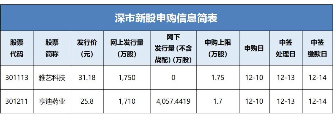 2021年12月10日,浙江雅艺金属科技股份有限公司(简称:雅艺科技)和湖北亨迪药业股份有限公司(简称:亨迪药业)将通过深交所网下发行电子平台和交易系统发行新股,具体信息如下。