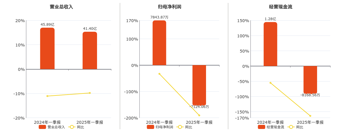 公司营业总收入为41.40亿元,较去年同报告期营业总收入减少4.50亿元,同比较去年同期下降9.80%。归母净利润为-7124.06万元,较去年同报告期归母净利润减少1.50亿元,同比较去年同期下降190.82%。经营活动现金净流入为-8168.56万元,较去年同报告期经营活动现金净流入减少2.10亿元,同比较去年同期下降163.74%。