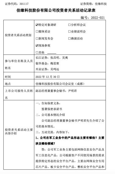 佳缘科技股份有限公司(以下简称“佳缘科技”或“公司”)2023年1月1日发布公告称,公司于2022年12月30日接受了长江证券、银华基金、兴业证券的特定对象调研和现场参观。在调研中,佳缘科技称,在国家“强化国家战略科技力量,实施一批具有前瞻性、战略性的国家重大科技项目”的政策指引下,佳缘科技目前处于一个较好的发展环境,迎来行业发展机会。