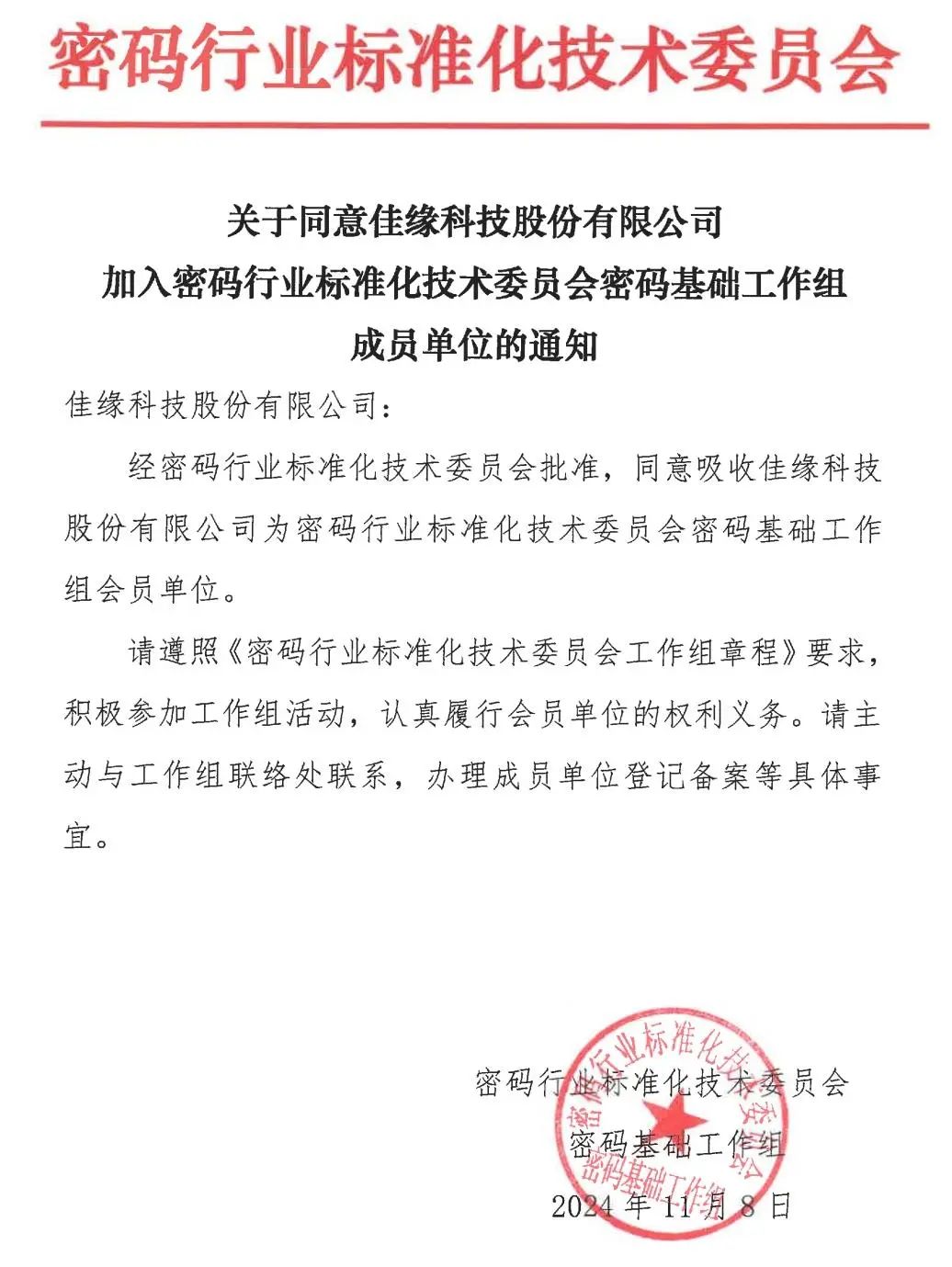 近日,密码行业标准化技术委员会(以下简称“密标委”)密码基础工作组批准佳缘科技股份有限公司正式成为成员单位。此次成功获批,一方面彰显了密标委对佳缘科技积极践行企业社会责任以及主动担当行业发展使命的充分肯定,另一方面,也意味着佳缘科技在密码行业标准化制定中将肩负起更大责任。