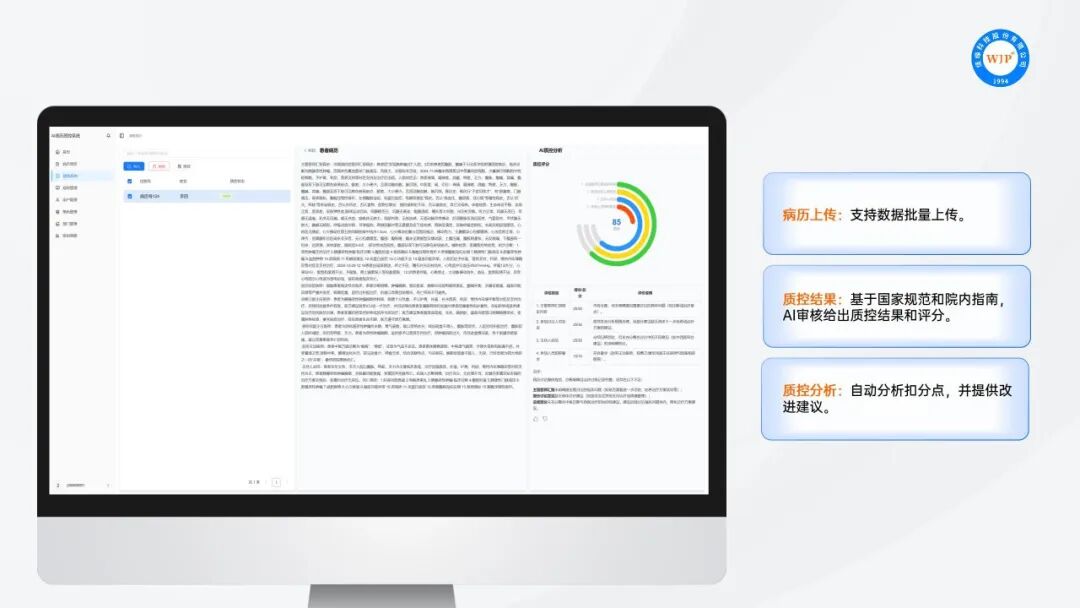 通过强大的智能辅助稽核功能,一体机协助质控人员进行批量审核与病历评分。针对发现的问题,质控人员可便捷地进行电子批注,形成专业的修改建议,并将包含明确反馈的质控结果退回相关科室及医生进行修正。独特的“AI质控分析”模块能对病历进行精细化量化评分,直观展现病历质量等级与改进方向。
