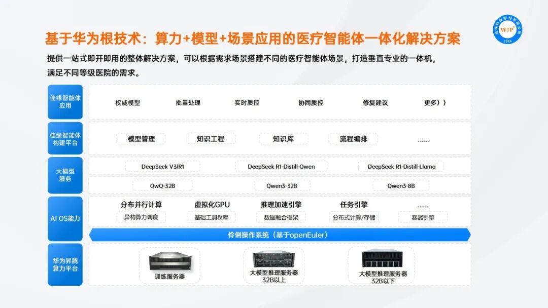 算力基座以华为昇腾AI原生计算平台为核心,其AI服务器与加速卡矩阵专为大规模并行计算与深度神经网络模型深度优化,为处理海量病历文本所需的高强度语义分析与逻辑推理任务提供了澎湃且高度优化的算力引擎。