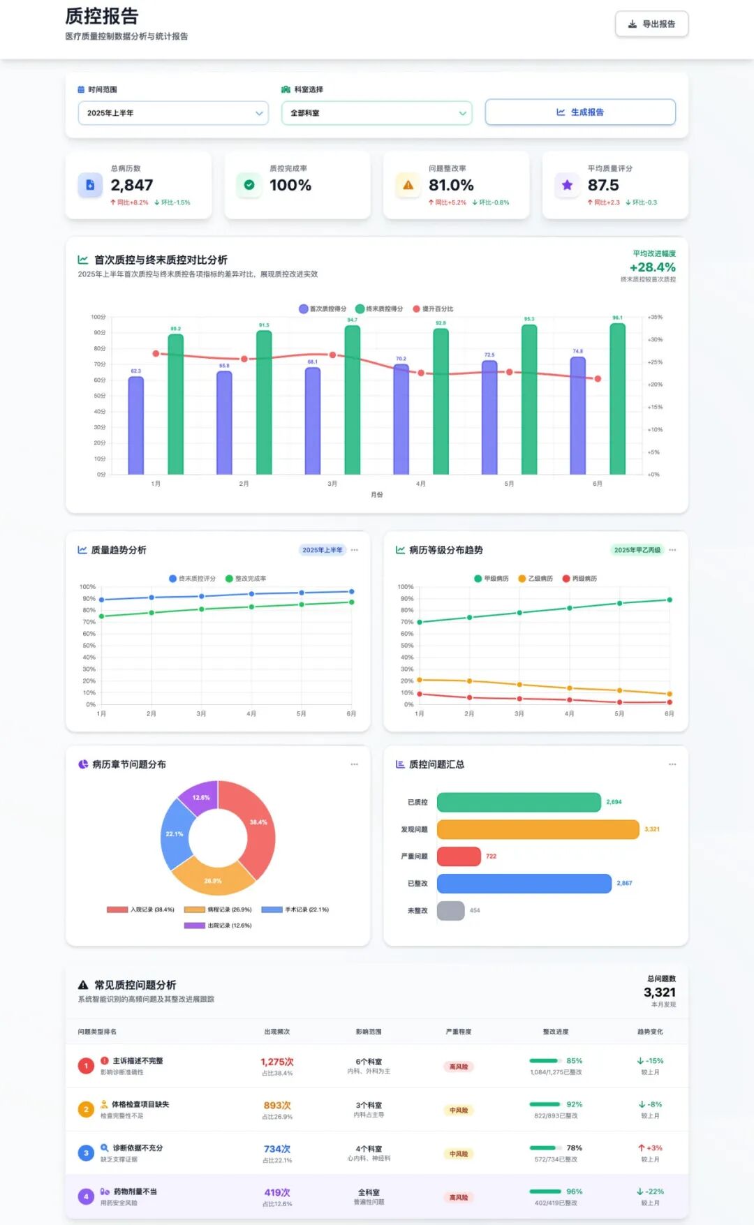 为院级领导及管理者量身打造定制化看板功能,通过可视化图表直观展示核心指标(如总病历数、质控完成率、问题整改率、平均质量评分及其变化趋势),并通过“首次质控与终末质控对比”量化AI应用成效(如平均改进幅度、病案完整性及诊断准确性等指标提升)。“常见质控问题分析”模块,从高频问题、影响科室、严重程度到整改进度与趋势,提供深度洞察。管理者亦可灵活筛选时间、科室进行数据钻取与科室绩效横向对比,精准制定改进策略,实现“运筹帷幄,数据领航”。