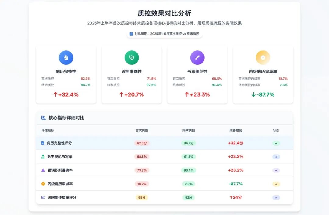 应用本系统后,病历的完整性、诊断的准确性及书写的规范性等关键内涵质量指标均实现质的飞跃,评分与达标率得到大幅提升,从根本上夯实了医疗质量的基石。