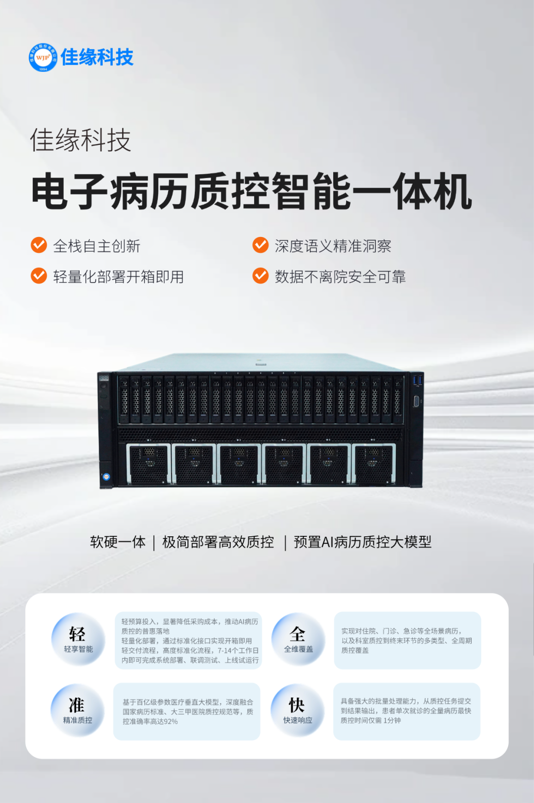 佳缘科技深信,未来的医疗质量管理,将不再是繁重的人力堆砌,而是人机协同的智慧共舞。电子病历质控智能一体机,正是为这一未来而生。它打破尖端AI技术应用的壁垒,让每一家医院共享技术红利,将医务人员从繁琐的文书工作中解放出来,让管理因智而变,使医疗因质卓越。