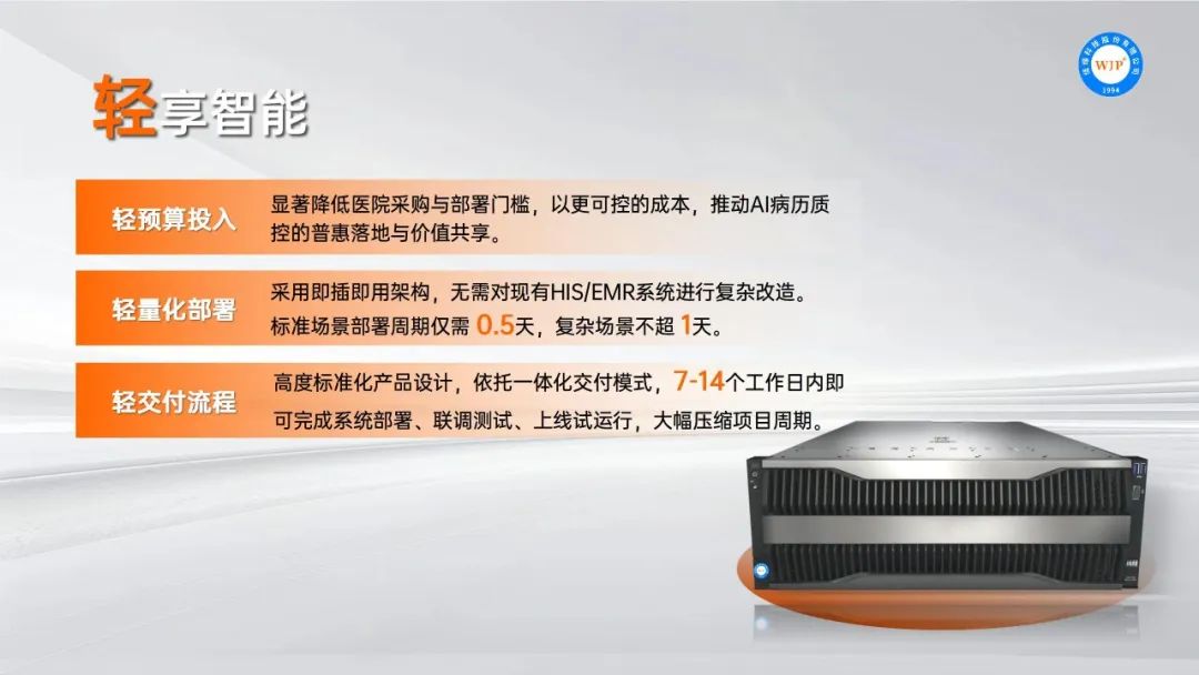 一体机以“三轻”核心竞争力——轻量化部署、轻预算投入、轻交付流程,专注AI病历质控领域,让尖端科技触手可及。