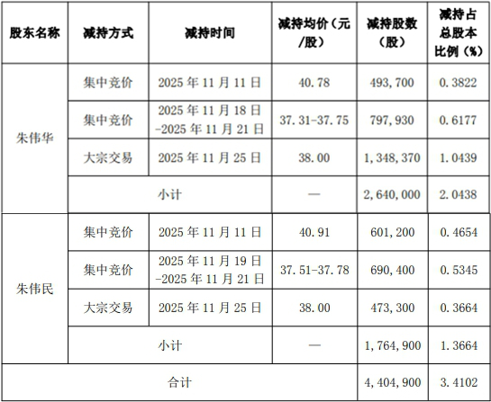 2025年11月11日至2025年11月25日,朱伟华、朱伟民减持股数合计4,404,900股,减持金额合计1.7亿元。