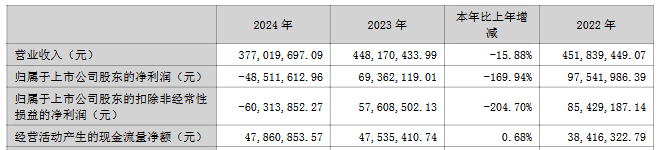 2024年,公司实现营业收入3.77亿元,同比下降15.88%;归属于上市公司股东的净利润为-4,851.16万元,上年同期为6,936.21万元;归属于上市公司股东的扣除非经常性损益的净利润为-6,031.39万元,上年同期为5,760.85万元;经营活动产生的现金流量净额为4,786.09万元,同比增长0.68%。