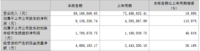 新特电气(301120.SZ)日前披露的2025年一季度报告显示,2025年1-3月,公司实现营业收入8,816.67万元,同比增长19.98%;归属于上市公司股东的净利润为913.82万元,同比增长112.87%;归属于上市公司股东的扣除非经常性损益的净利润为170.07万元,同比增长46.61%;经营活动产生的现金流量净额为468.82万元,同比增长36.16%。