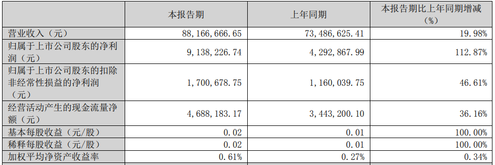 2025年1-3月,公司实现营业收入8,816.67万元,同比增长19.98%;归属于上市公司股东的净利润为913.82万元,同比增长112.87%;归属于上市公司股东的扣除非经常性损益的净利润为170.07万元,同比增长46.61%;经营活动产生的现金流量净额为468.82万元,同比增长36.16%。