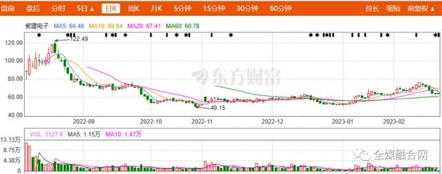 《全媒融合网》注意到,紫建电子上市之后,该公司股价冲高回落,逐渐下跌到发行价附近,截止2023年2月20日该公司收盘价为64.03元/股。