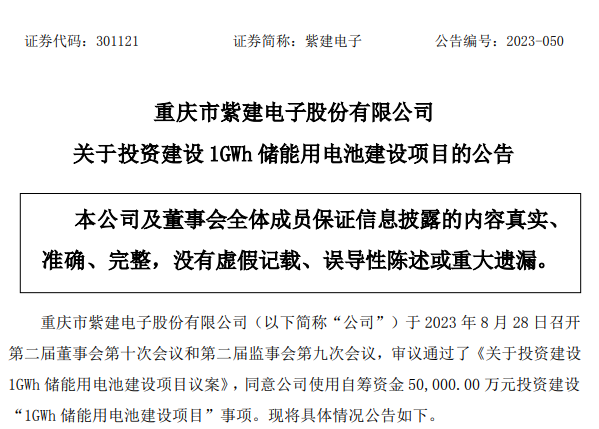 紫建电子8月28日晚间公告,拟通过全资子公司——深圳市维都利电子有限公司设立新公司投资建设“1GWh储能用电池建设项目”,通过新建产线,引进先进生产设备及信息化系统等,重点建立中高端家庭储能电池生产基地。