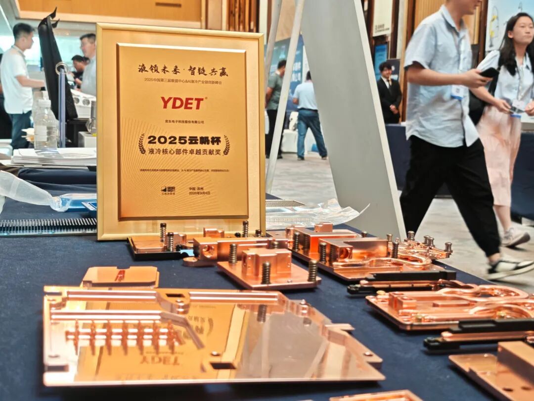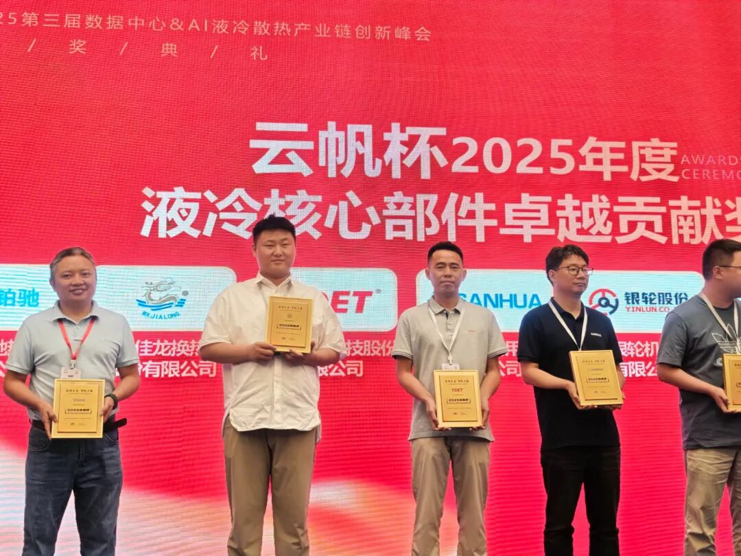 在本次峰会上,奕东电子不仅充分展示了公司在液冷散热领域的创新成果与技术实力,其展出的一系列产品吸引了众多参会者的目光,成为展馆内的焦点之一。这些产品涵盖了 AI 计算芯片液冷散热结构件、液冷板组件等多个品类,均具备高性能、高可靠性等特点,能够完美满足数据中心和 AI 领域对于散热的严苛需求。而且,凭借在液冷核心部件研发制造上的卓越表现,奕东电子一举荣获云帆杯液冷核心部件卓越贡献奖。这一奖项是对在冷板、歧管、快接头、CDU、传感器、泵、换热器等关键部件研发制造上表现卓越的企业的高度认可,奕东电子获此殊荣,可谓实至名归。