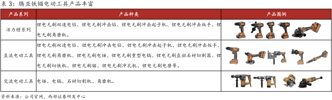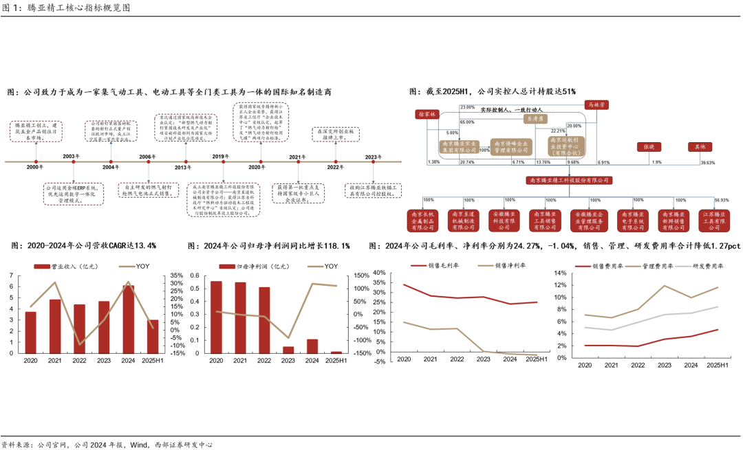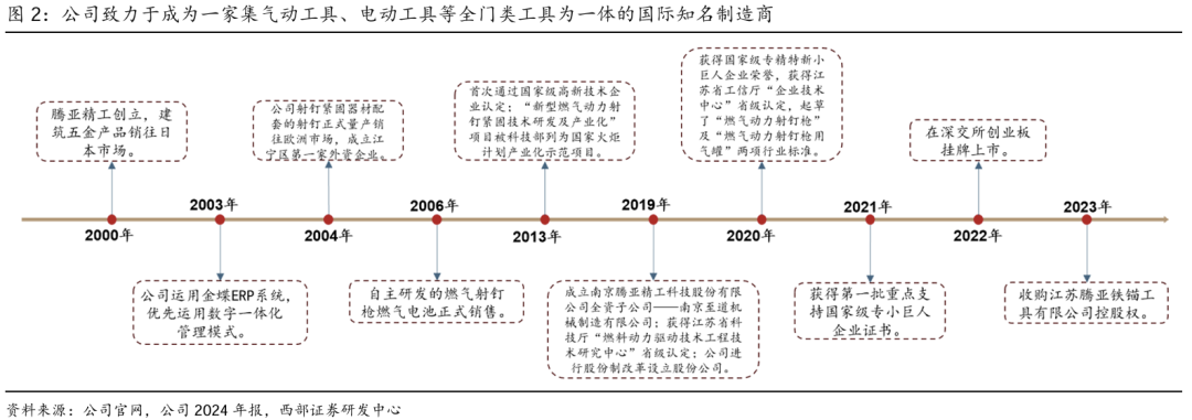 建筑五金业务起家,产品远销全球多地。2000年,腾亚精工创立,主要从事对日本的五金制品贸易;2004年,公司射钉紧固器材正式量产,销往欧洲;2006年,公司自主研发的燃气射钉枪燃气电池正式销售;2020年,公司起草了“燃气动力射钉枪”及“燃气动力射钉枪用气罐”两项行业标准;2022年公司在深交所上市;2023年,公司收购江苏腾亚铁锚工具有限公司控股权。目前,公司产品涵盖瓦斯工具、气动工具、电动工具、园林工具以及通风口、检查口、地板支撑等中高端建筑五金结构件,产品远销日本、欧洲、澳洲、南美、印度、西亚等国家和地区。