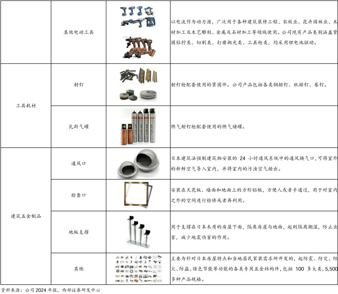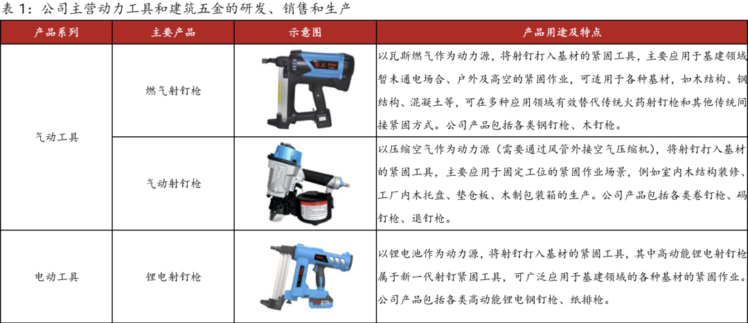 公司主营业务为动力工具和建筑五金制品的研发、生产与销售,其中动力工具以燃气射钉枪及其配套的射钉、瓦斯气罐为核心,包括燃气射钉枪、气动射钉枪等气动工具和锂电射钉枪、电锤、电钻等电动工具;建筑五金制品主要产品包括通风口、检查口、地板支撑等中高端建筑五金制品。