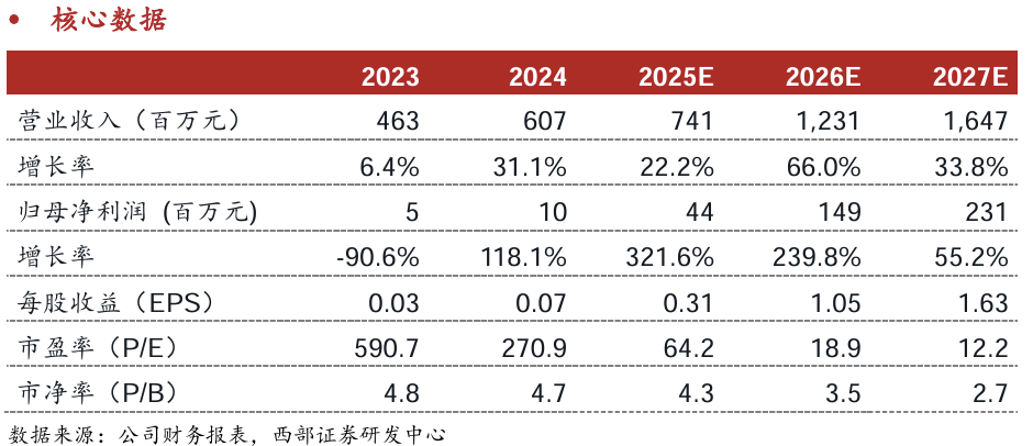 综上所述,我们预计公司2025-2027年实现营业收入7.41、12.31、16.47亿元,同比分别提升22.2%、66.0%、33.8%,CAGR达49.1%,实现归母净利润0.44、1.49、2.31亿元,同比分别增长321.6%、239.8%、55.2%,CAGR达129.69%。