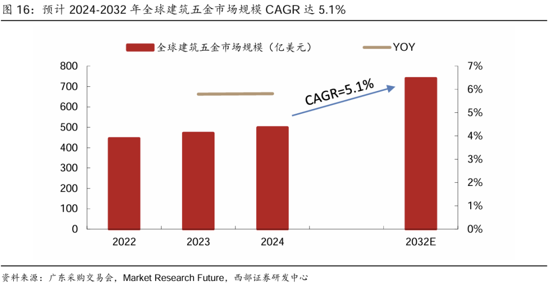 建筑五金行业市场规模稳步增长,品类及性价比成为行业竞争关键。据Market Research Future数据,2024年,全球建筑五金市场规模达498.2亿美元,同比增长5.8%,预计2032年将达739.7亿美元,2024-2032年CAGR达5.1%。目前,建筑五金制品行业生产工艺已较为成熟,行业竞争重点在于能否构建品类丰富、质优价中的中高端建筑五金集成供应平台,从而满足下游核心客户的一站式采购需求。