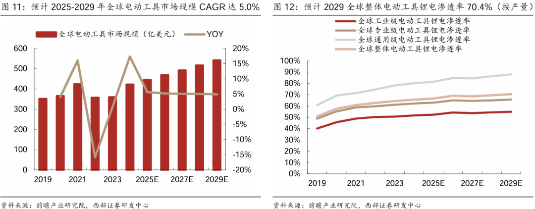 全球电动工具市场锂电化趋势明显,带动电动工具整体市场发展。电动工具是指电动或电池供电的设备,旨在使钻孔、切割、打磨和紧固等任务更快、更高效。据前瞻产业研究院数据,按产量来说,2024年全球整体、工业级、专业级、通用级电动工具锂电渗透率分别达65.6%、51.6%、62.2%、80.1%,同比分别增长1.0pct、1.1pct、1.9pct、1.3pct,预计2029年全球整体、工业级、专业级、通用级电动工具锂电渗透率分别将达70.4%、54.9%、65.7%、88.0%。2024年全球电动工具市场规模达421.0亿美元,同比增长17.3%,预计2025年达444.6亿美元,2029年达540.9亿美元,2025-2029年CAGR达5.0%。