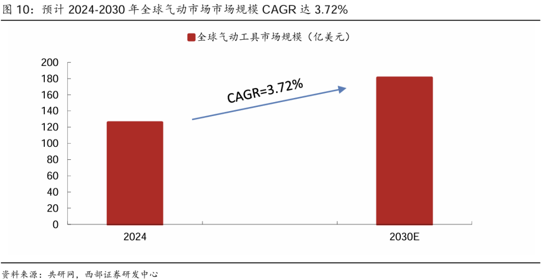 全球气动工具市场规模稳中有升。气动工具是一种以压缩空气为动力源,驱动内部机械结构运转,从而完成特定作业任务的工具。据共研网数据,2024年全球气动工具市场规模达126亿美元,预计2030年全球气动工具市场规模达181亿美元,2024-2030年CAGR达3.72%。