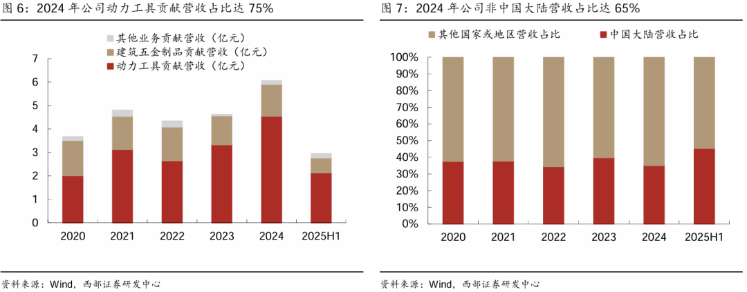 动力工具业务营收占比提升,非中国大陆业务收入占比超6成。从产品结构来看,2020-2024年公司动力收入CAGR为22.71%,占比从54.64%提升至75.01%;清洗系统收入CAGR为-2.47%,占比从41.04%减少至22.48%。从地区结构来看,2024年非中国大陆业务收入占比达64.88%,同比增长4.68pct。