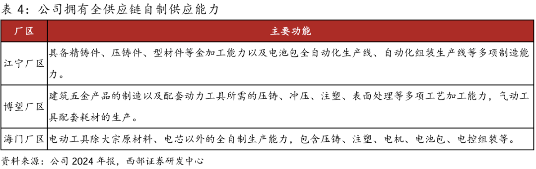 公司拥有全供应链自制供应能力。公司目前已经形成三大制造基地,分别为江宁厂区、博望厂区、海门厂区。其中博望厂区是公司最大生产建造基地,涵盖了建筑五金产品的制造以及配套动力工具所需的压铸、冲压、注塑、表面处理等多项工艺加工能力和气动工具配套耗材的生产;江宁厂区拥有数控加工设备,具备精铸件、压铸件、型材件等金加工能力以及电池包全自动化生产线、自动化组装生产线等多项制造能力;海门厂区具有电动工具除大宗原材料、电芯以外的全自制生产能力,包含压铸、注塑、电机、电池包、电控组装等。
