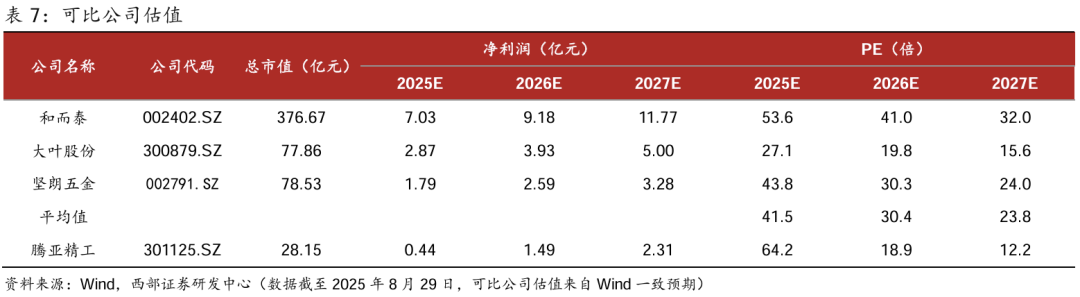 我们认为公司在动力工具领域,有望通过新品与出海稳健增长;建筑五金领域市场份额有望提升;机器人领域业绩快速放量。估值方面,我们选取电动工具及机器人上游公司和而泰、园林机械领域拥有割草机器人概念的大叶股份、以及同样拥有五金+机器人业务的坚朗五金作为可比公司,根据Wind一致预期,可比公司2025-2027年平均PE估值为41.5、30.4、23.8倍,腾亚精工2025-2027年实现归母净利润0.44、1.49、2.31亿元,同比分别增长321.6%、239.8%、55.2%,CAGR达129.69%,对应PE估值为64.2、18.9、12.2倍,2025年高于可比公司平均估值,2026-2027年低于可比公司平均估值,首次覆盖给予“买入”评级。