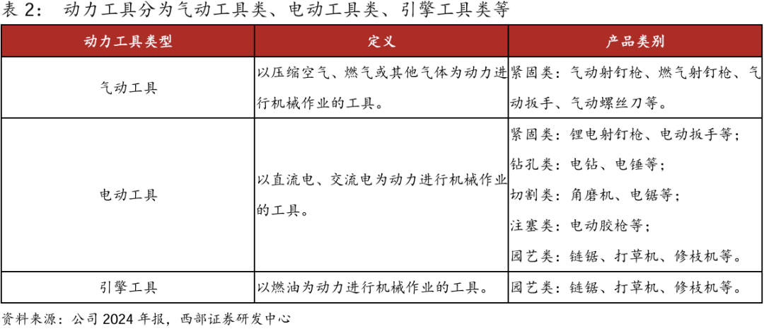 公司动力工具产品主要为射钉紧固器材。公司的主要动力工具产品以燃气射钉枪及其配套的射钉、瓦斯气罐为核心,包括燃气射钉枪、气动射钉枪等气动工具和锂电射钉枪、电锤、电钻等电动工具,应用领域覆盖建筑工程、装饰装修以及工业制造中的木材加工、金属加工、包装固定等。其中,燃气射钉枪、气动射钉枪、锂电射钉枪均用于射钉紧固类作业,统称为射钉紧固器材。